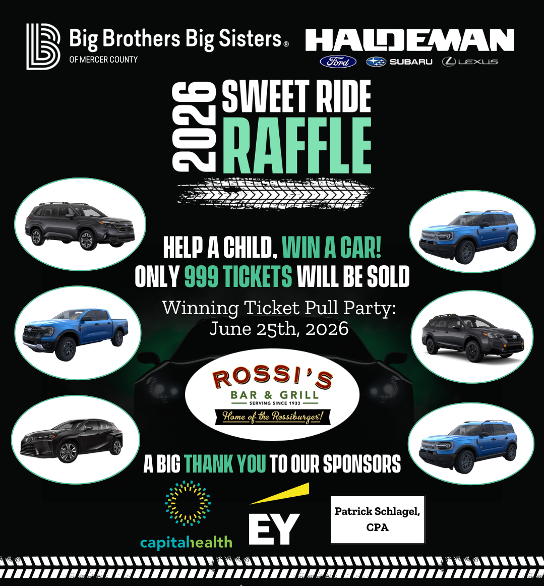 Big Brothers Big Sisters of Mercer County invites you to participate in our 2026 Sweet Ride Raffle — your chance to win an incredible vehicle while helping local youth reach their full potential.